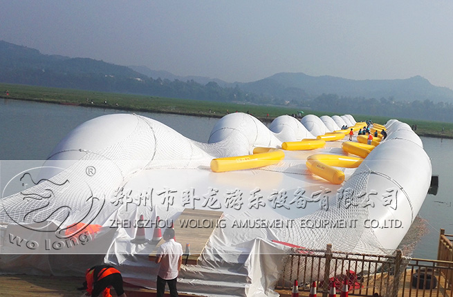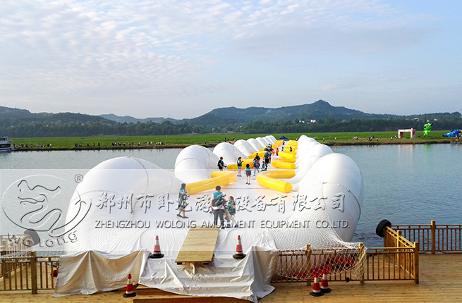蹦床橋又稱之為充氣橋,其設(shè)計輕便靈活,是采用圓拱形充氣浮胎結(jié)構(gòu)作為整套設(shè)備支撐結(jié)構(gòu),每個單體通過高結(jié)構(gòu)件連接,橋體兩側(cè)采用斜拉鋼索與主固定鋼絲連接,橋面采用高強度柔性夾網(wǎng)pvc材料,游客可以在柔性橋面上彈跳通過,本設(shè)備還配有獨立的供氣系統(tǒng)和自動減壓裝置,并且將每個蹦床做成一個單元進行連接,每個環(huán)狀單元的中間由彈性網(wǎng)布構(gòu)成,環(huán)狀充氣部分采用了是聚氯乙烯(PVC)膜材料。加上充氣部分本身具備的浮力,可以對產(chǎn)品有很好的支撐作用。蹦床橋可以根據(jù)客戶需求設(shè)計定制的哦!所以在其它寬度的河面上,只要進行微調(diào),都可安裝上這種蹦床橋。